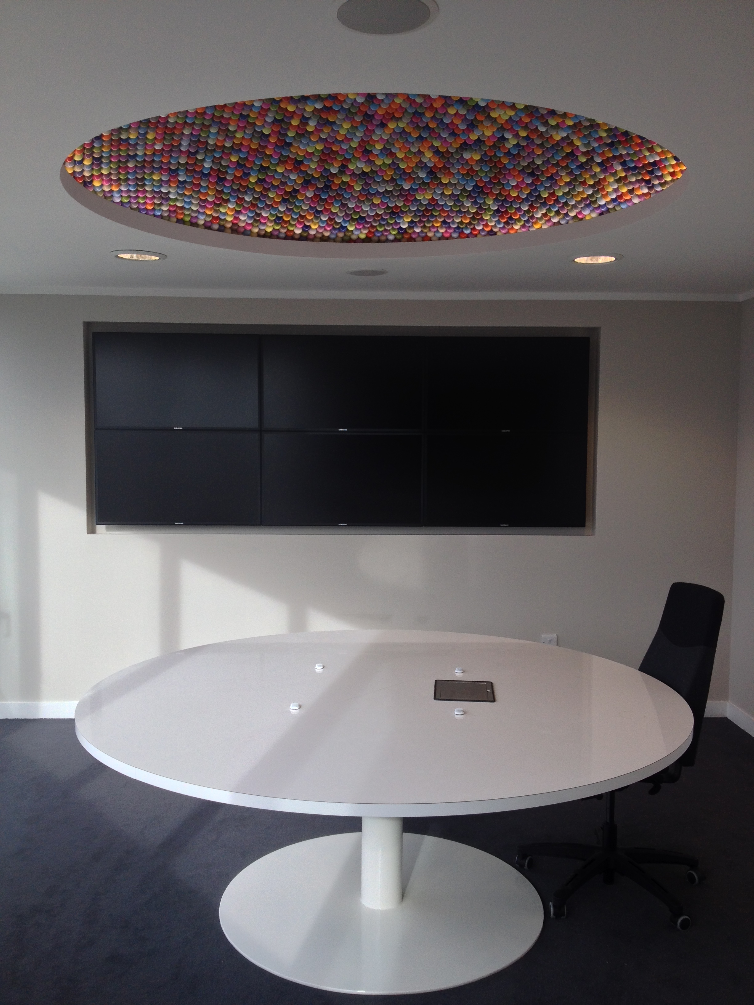 Designers comment: No matter what the size project the focus and involvement remains the same. Brainstorming with the client and interior designer we came up with the Ping pong ceiling, brilliant acoustics.